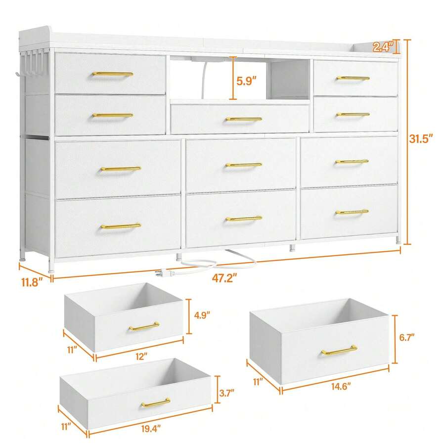 Dresser For Bedroom With 11 Drawers 60" TV Stand With LED Lights & Charging Station Long Dresser With Shelves & 4 Hooks,Sturdy Metal Frame & Fabric Drawers,White