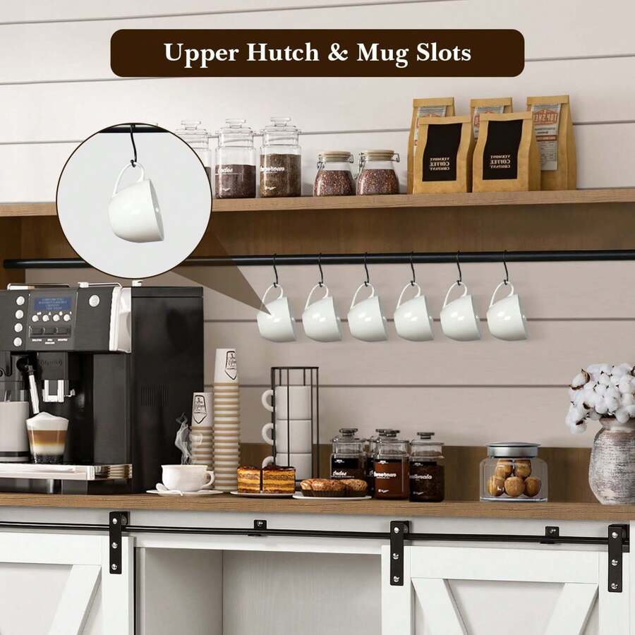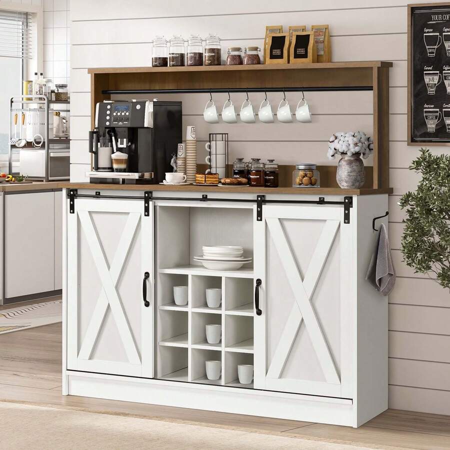 47" Farmhouse Buffet Cabinet With Storage, Farmhouse Coffee Bar Cabinet With Wine Racks And 6 Hooks, Coffee Bar Hutch With Storage For Entry Way, Hallway,Living Room, White/Brown/Gray