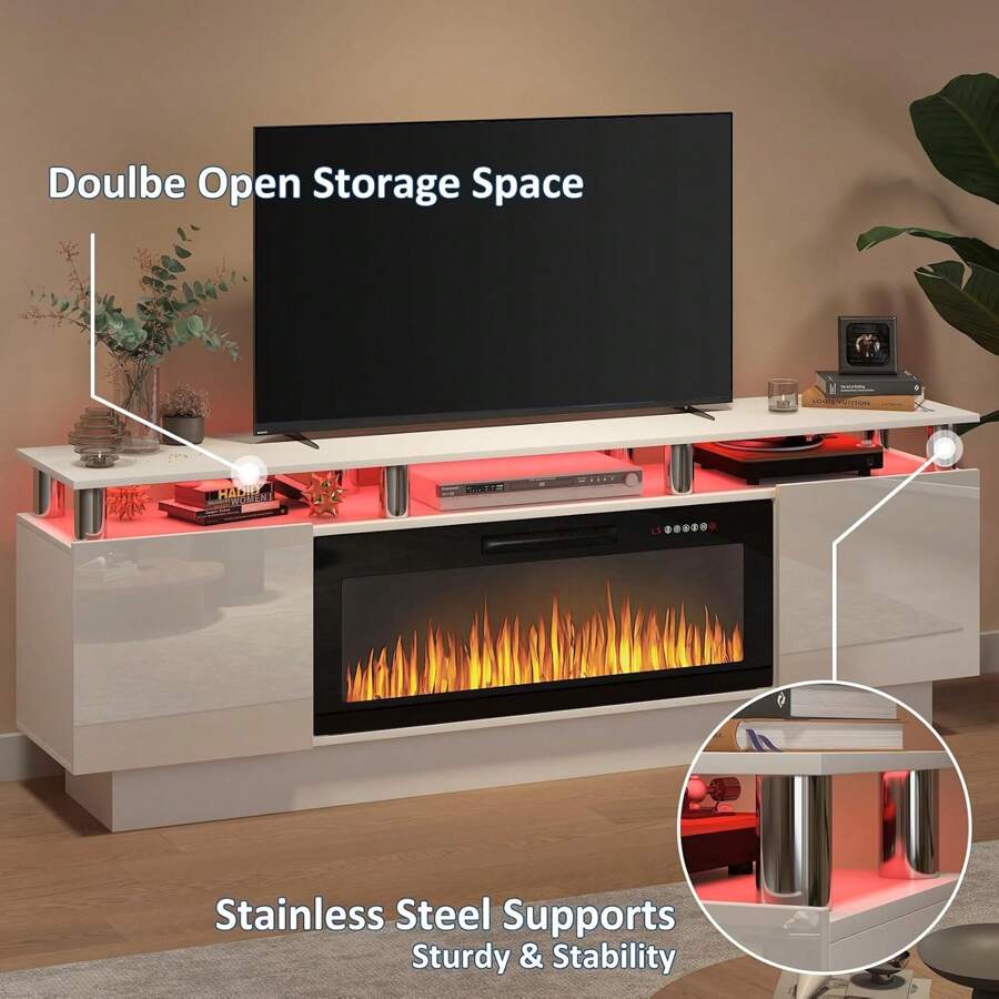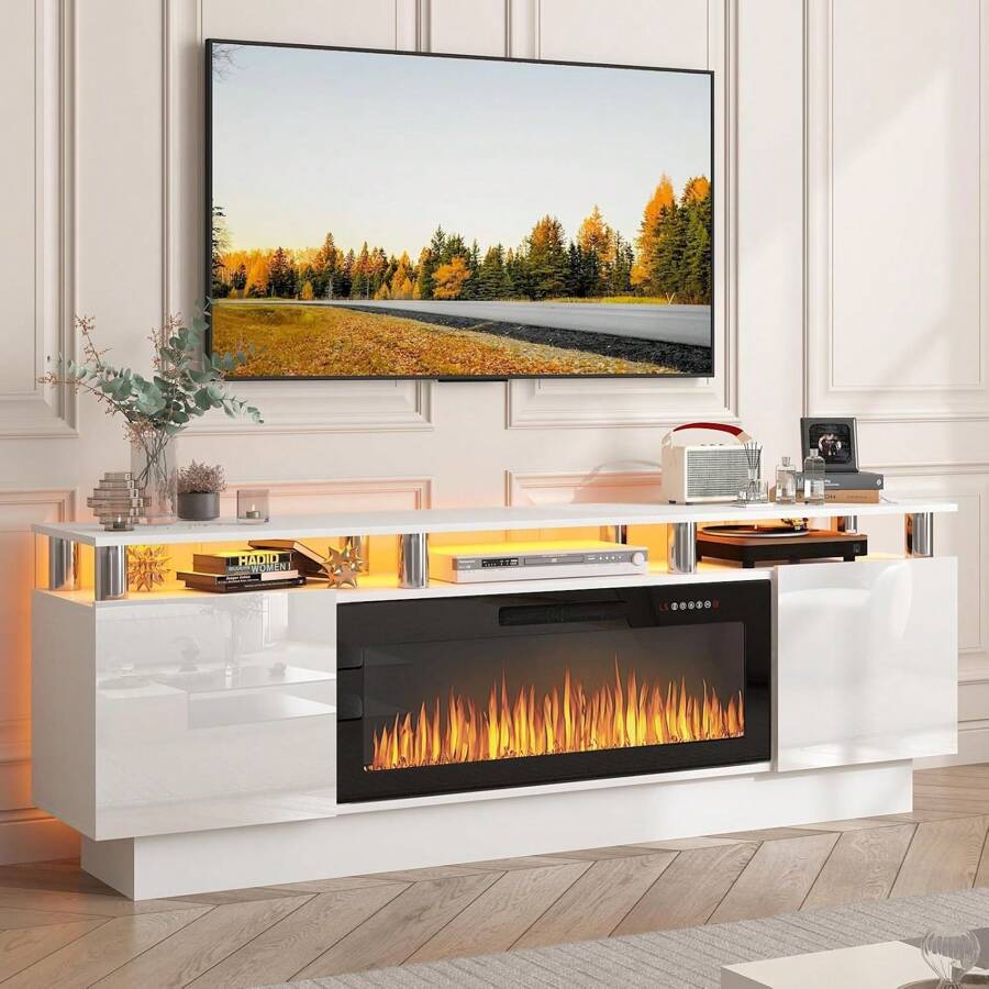 70" Modern Fireplace TV Stand With 36" Electric Fireplace For TVs Up To 80", Luxury LED-Lit Entertainment Center With High-Gloss Grey Cabinet, Perfect For Living Room, Halloween Decor