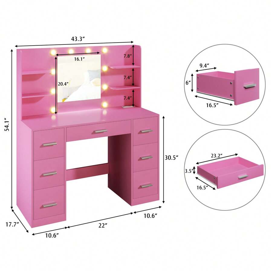 43" Vanity Desk Set With Power Outlet, Makeup Vanity Table With Bulbs Mirror 3 Color & Brightness Adjustable 7 Drawers For Storage, Makeup Vanity Desk With Outlets, Large Mirror With Light Bulbs Color & Brightness Adjustable.