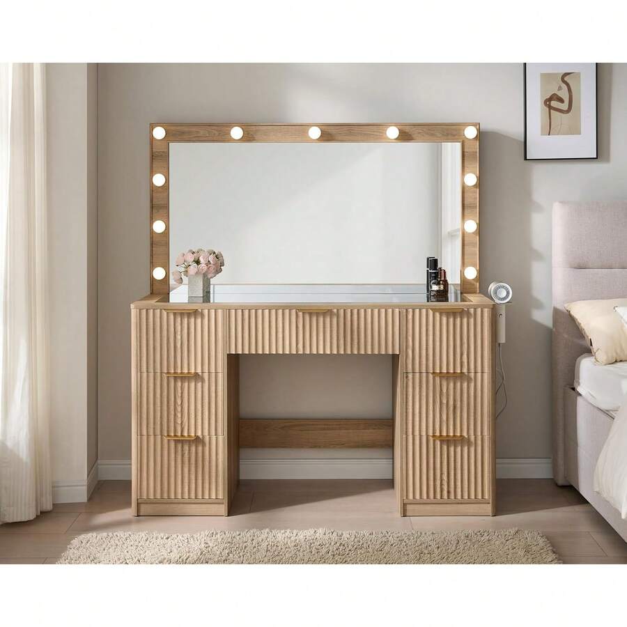 47.2" Fluted Vanity Desk With Large Mirror And Adjustable LED Lights, Makeup Vanity With 7 Drawers, Glass Top And Charging Station For Bedroom Or Dorm, Women And Girls, Natural Oak