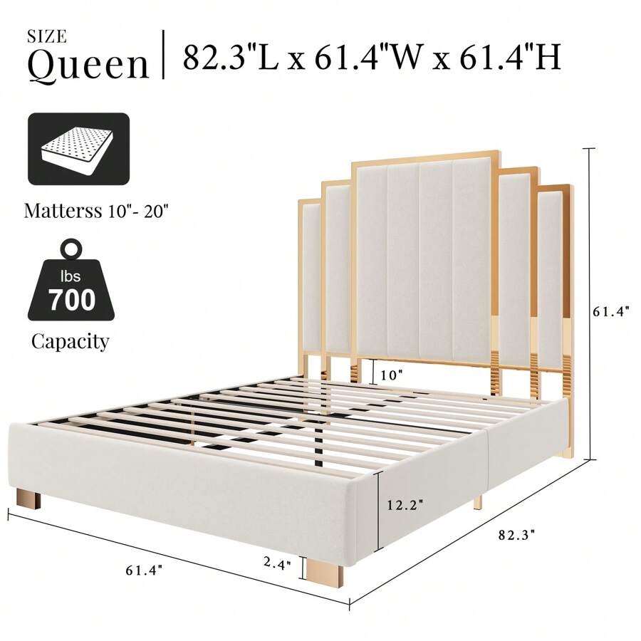 Queen/King Upholstered Velvet Bed Frame With Gold Trim Headboard, Sturdy Modern Platform Design, No Box Spring Required, White