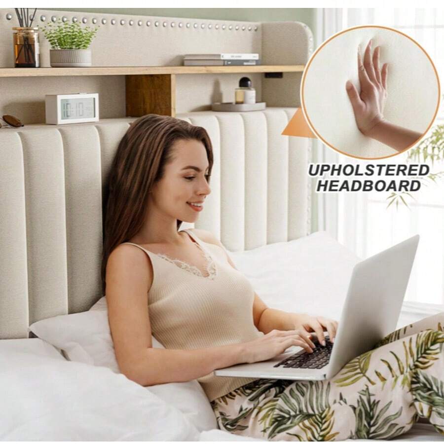 Full Bed Frame With 2-Tier Storage Headboard, Upholstered Platform Bed Frame With 2 Storage Drawers, Sturdy Wooden Slats Support, Noise-Free, No Box Spring Needed, Beige