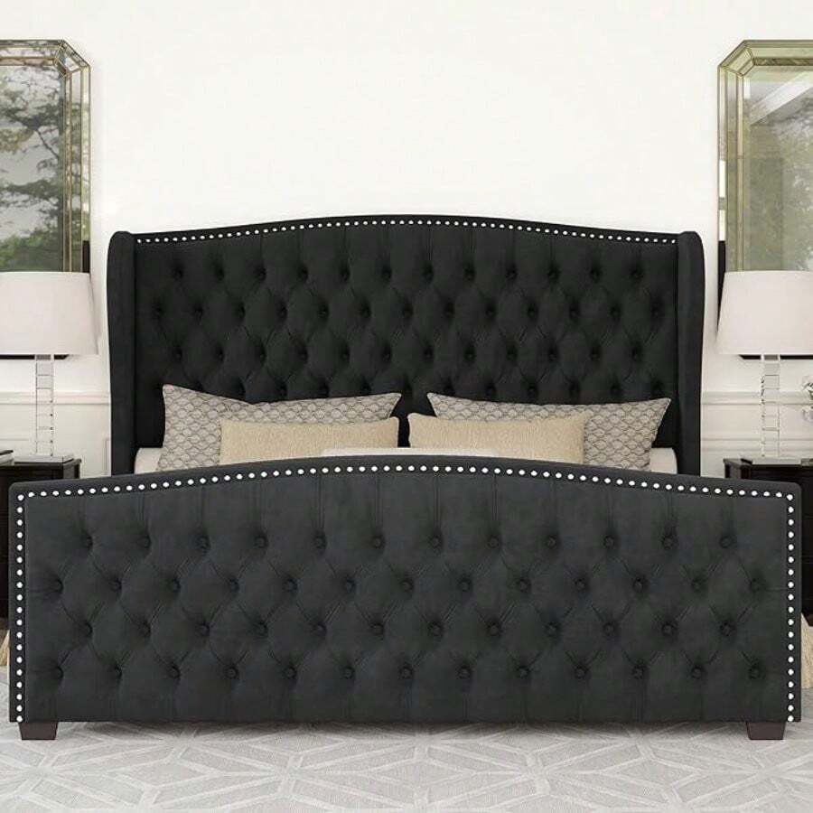 Platform Bed Frame, Velvet Upholstered Bed With Deep Button Tufted & Nailhead Trim Wingback Headboard/No Box Spring Needed/Black