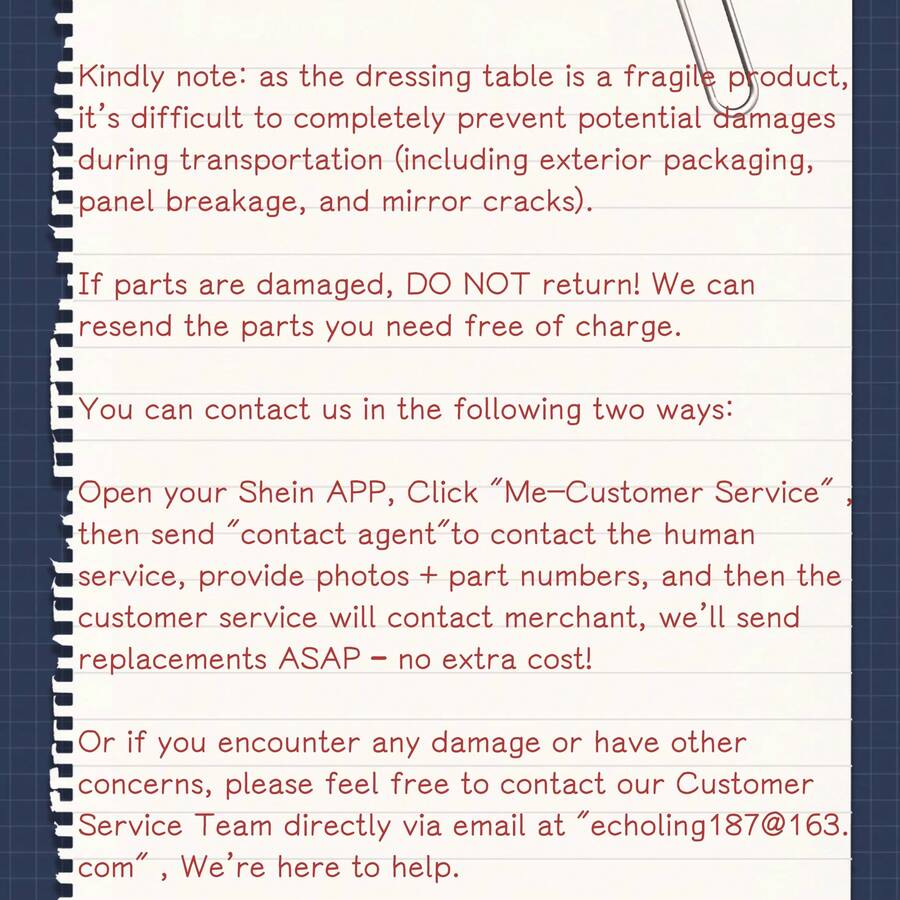 Kindly note that as the dressing table is a fragile product, it's difficult to completely prevent potential damages during transportation (including exterior packaging, panel breakage, and mirror cracks).