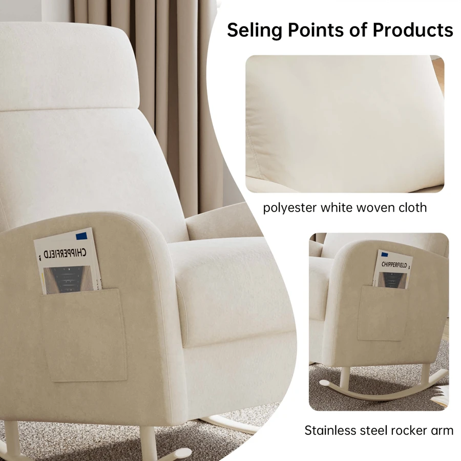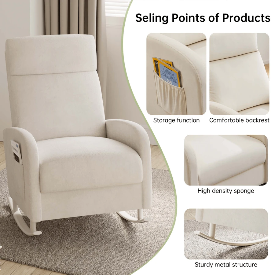 [Cloud-Like Cushioning That Lasts] Sink into premium high-density foam that molds to your curves without sagging.The extra-thick padding on the seat and backrest delivers full-body support, whether you're binge-watching, reading, or napping.Breathable fabric and a side pocket (fits magazines/remotes) make this Rocking Chair your go-to lounge hub.