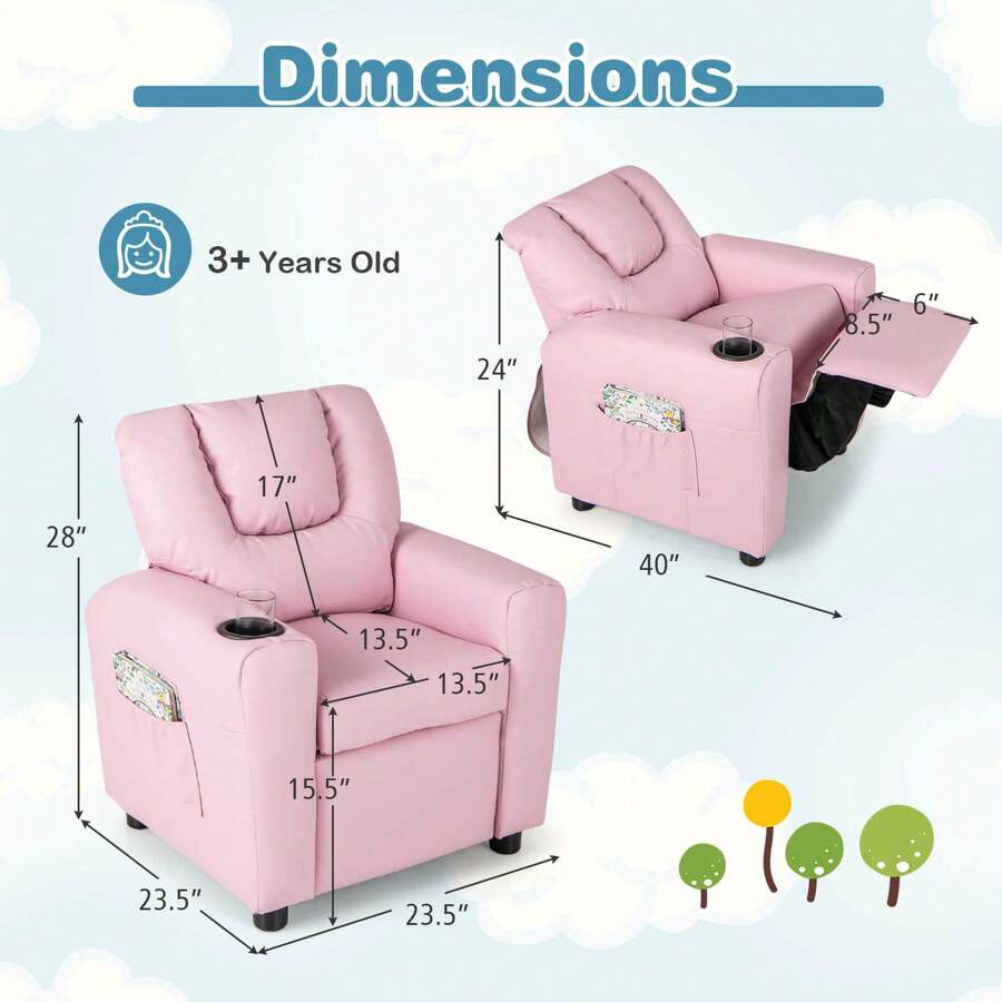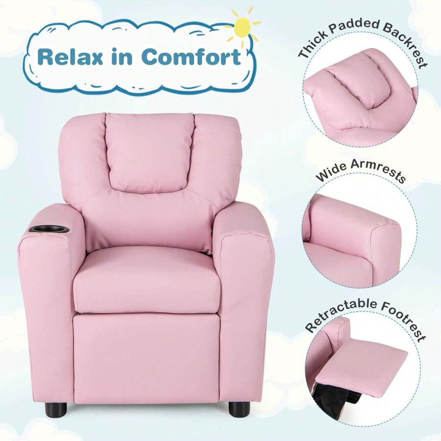 This push-back recliner features an adjustable backrest and footrest, which seamlessly adapt to the varying needs of kids. Whether it's time to sit up and engage in activities or recline for a peaceful nap, the flexibility of this chair accommodates all. The high-density sponge padded backrest and seat provide a comfortable sitting experience. Upholstered in premium PU leather, this kids sofa looks luxurious and is easy to clean. The built-in cup holder and handy side pocket further enhance its functionality, keeping beverages or favorite toys within easy reach. Moreover, constructed from a solid wood frame, this children's recliner is capable of supporting a maximum load of 440 lbs, making it a reliable option for growing kids.