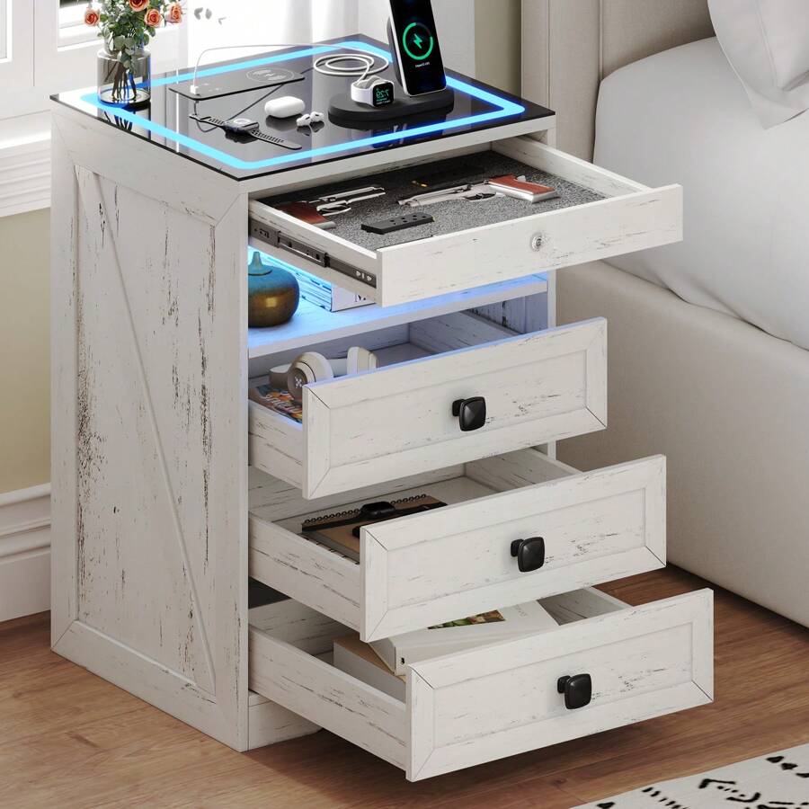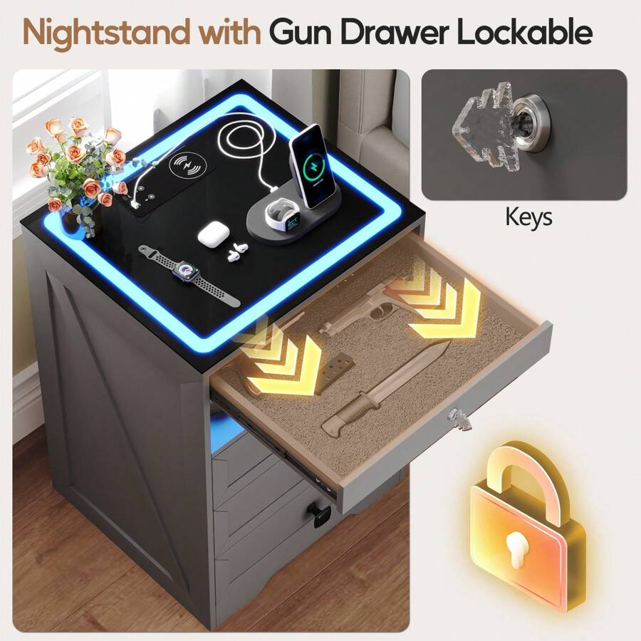 Gun Nightstand:The night stand comes with a hidden lockable gun drawer, providing you with a storage space for your valuables. which is perfect for gun owners who value both privacy and convenience