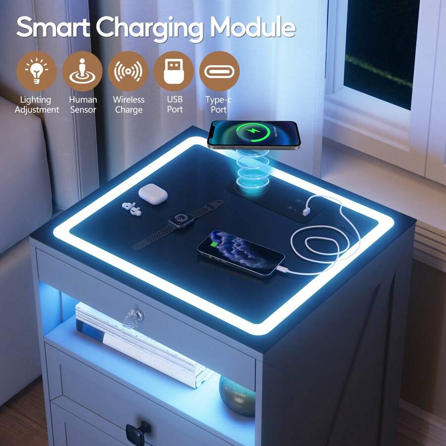 3 Color Lighting Options:The smart bedside table comes with beautiful 3 Color LED Lights.You can set the lighting according to your needs and preferences..Auto-sensing mode:auto-on when approaching, auto-off when leaving