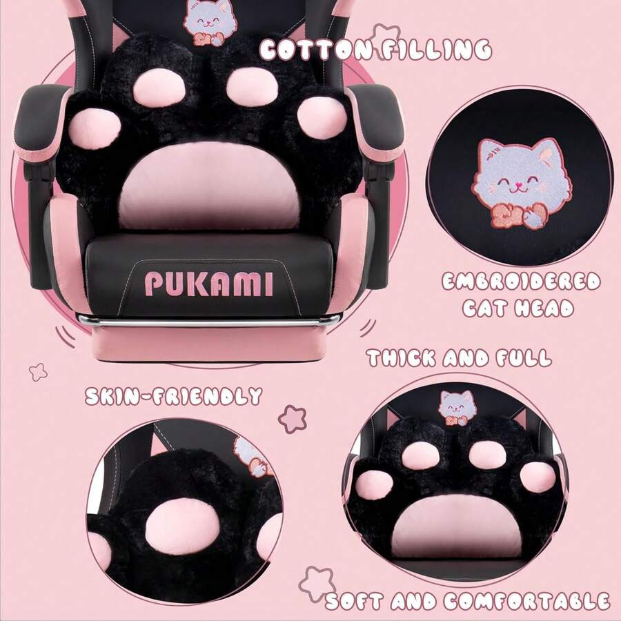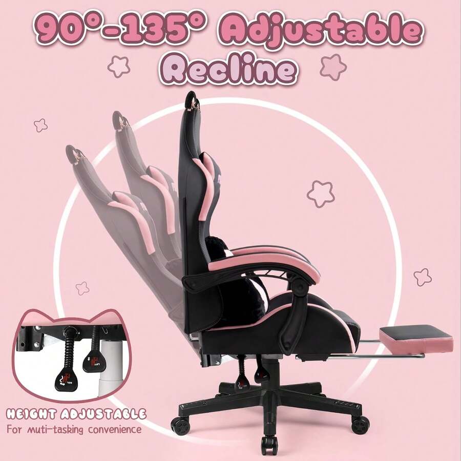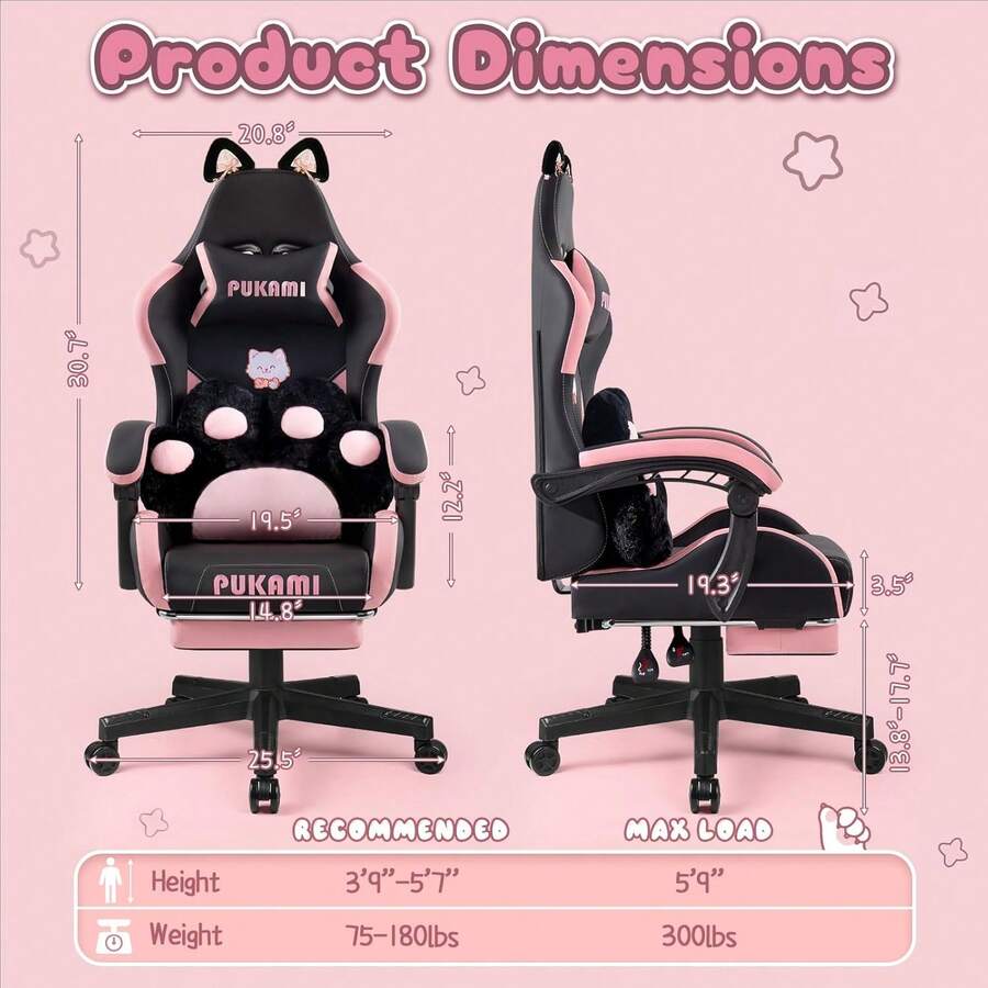 Super Cute: We've added cute cat ears to this gaming chair by replacing the regular lumbar pillow with a cat paw shaped lumbar pillow, and the cat head embroidery on the backrest makes the chair even more vivid and cute.The cat ears are removable, so you can replace them with your favourite decorations Ergonomic & Comfortable: This gaming chair features linked armrests that move with the tilt of the backrest to keep your arms comfortably supported at all times.The high density foam padded cushion and backrest take this chair to the next level of comfort, keeping you relaxed and comfortable during long hours of use Multi-Function: The chair's backrest can be adjusted from 90-135°, and the headrest and lumbar support cushion positions can be adjusted to suit your sitting position.The cushion height can be raised or lowered from 13.8 to 17.7 inches to accommodate a wide range of seating positions and people.When it's time to relax in the chair, you can pull out the retractable footrest underneath the chair and enjoy your leisure time in comfort Easy to assemble: The package included everything that you need.Instruction with picture is easy to follow and assemble it.Girl and women can easily and effortlessly assemble the chair by yourself in 20 minutes Sturdy Structure: This kawaii gaming chair is made of all-steel frame, with SGS certified Class 3 gas lift and heavy duty base, the weight capacity of the chair can reach 275lbs, which ensures safety and durability at the same time of comfort Scenes:Home, Daily, Household, Game Room Power Supply:None Color:Pink+Black Material:Polyurethane(PU)
