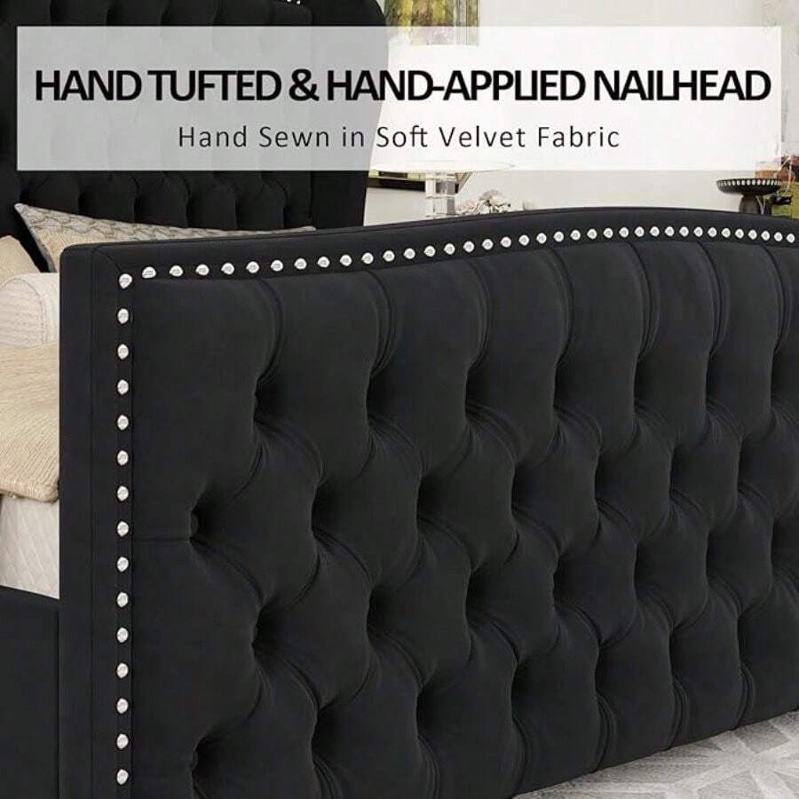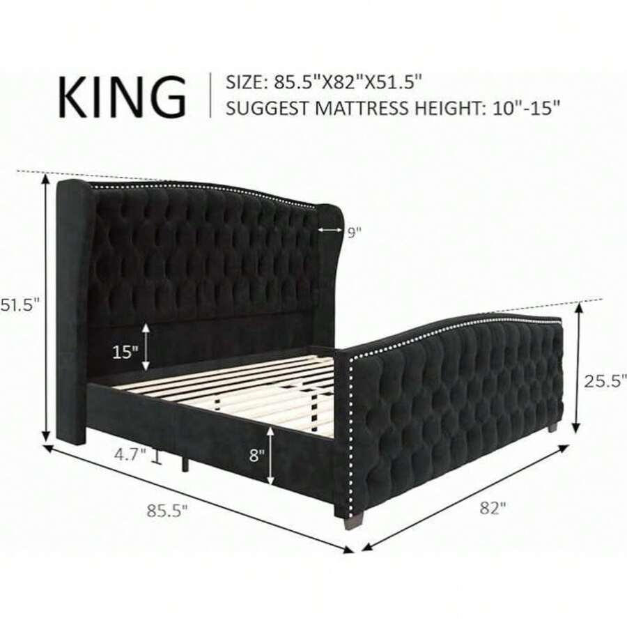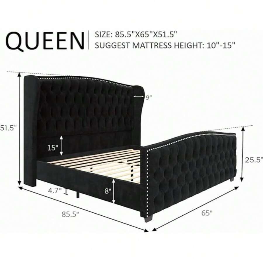 Grand and glamorous, our queen bed frame features elegant tall wingback headboard& deep diamond tufted footboard, stealing spotlight in your bedroom decor.