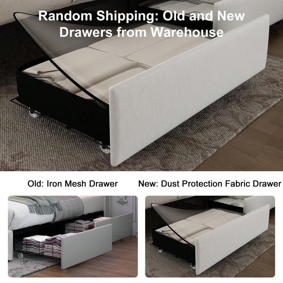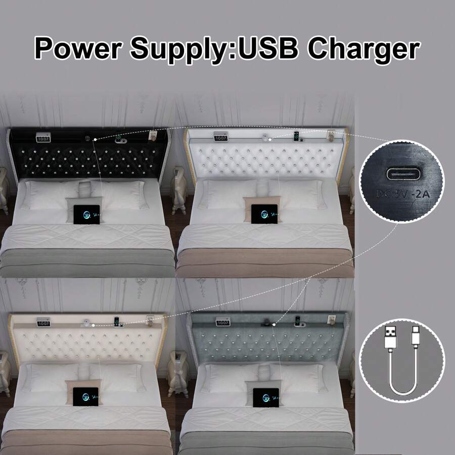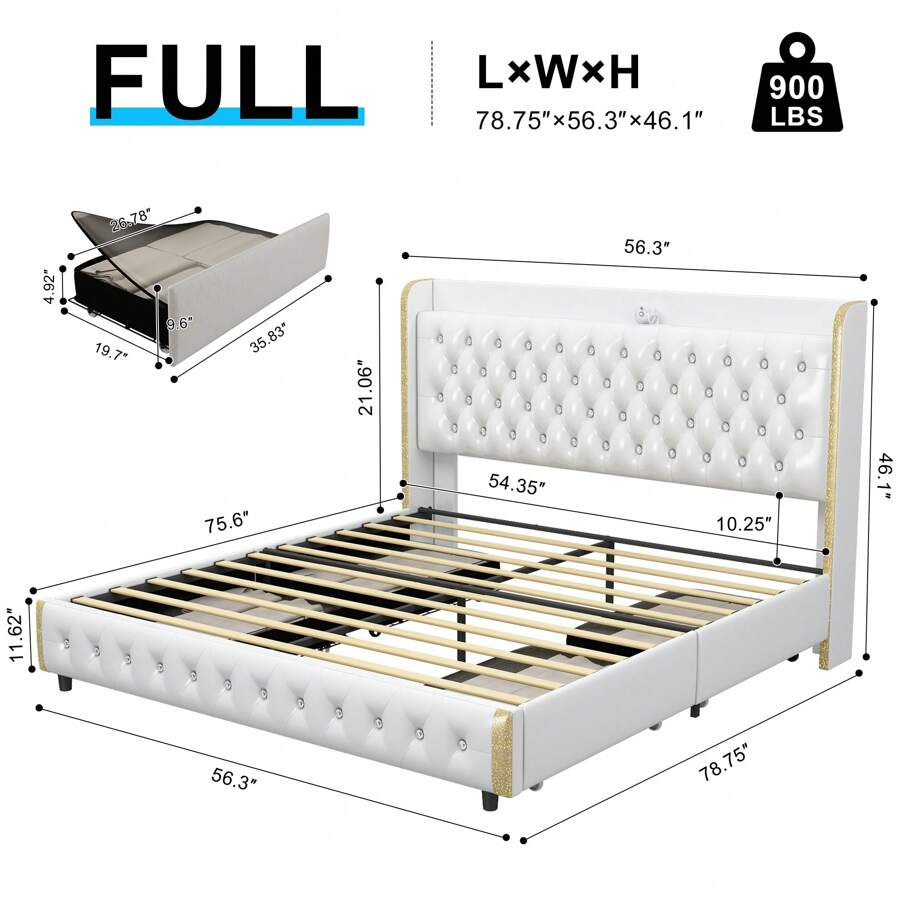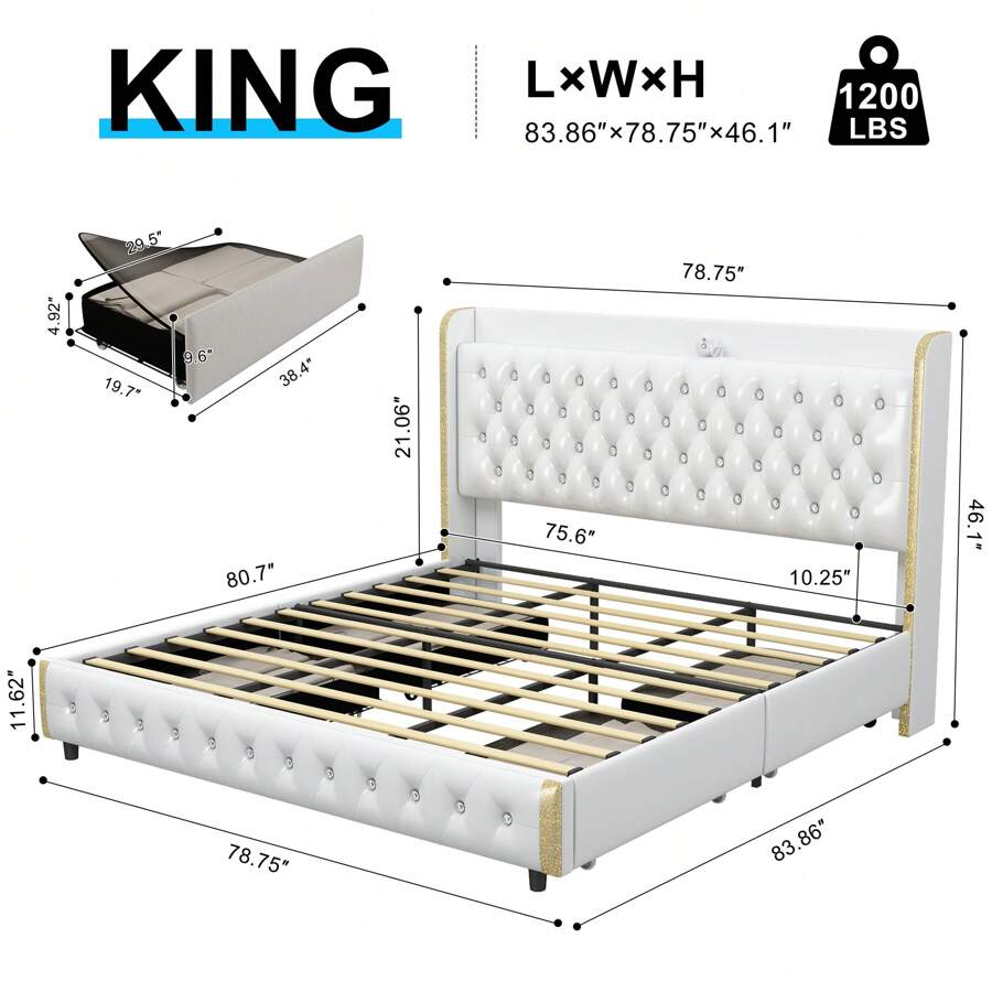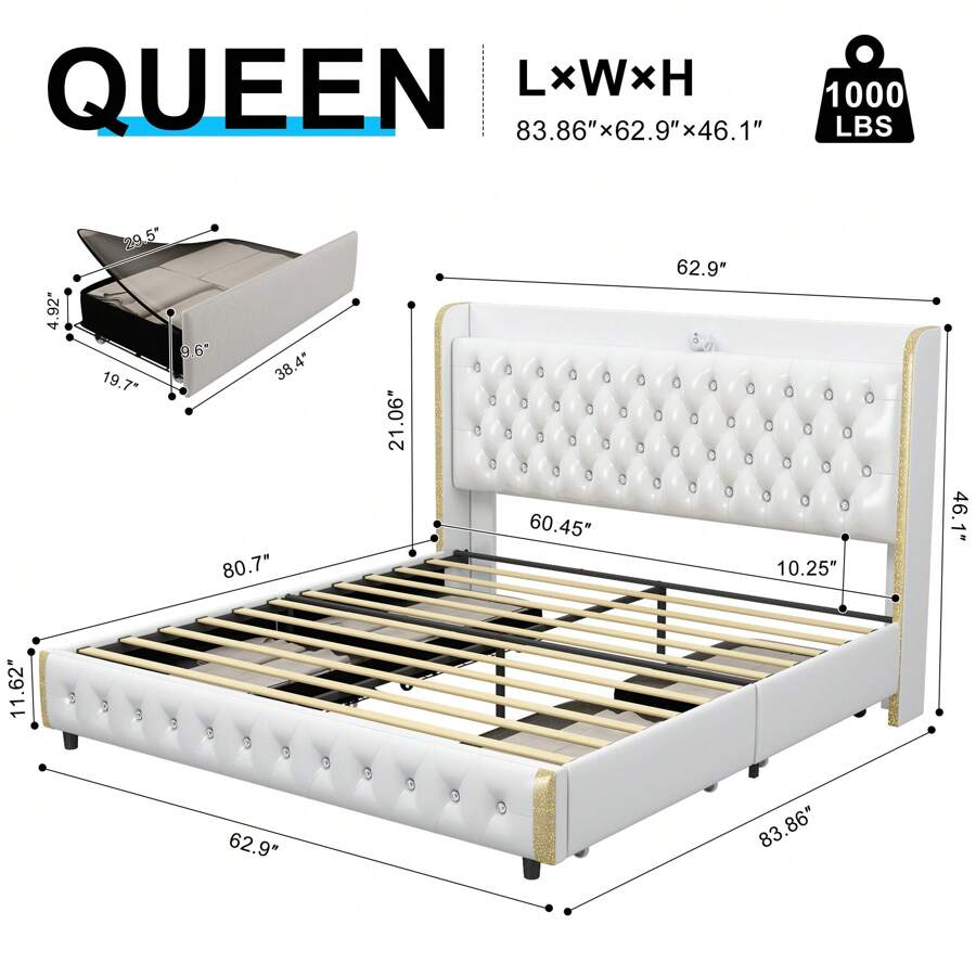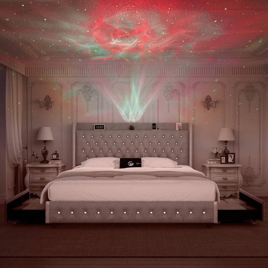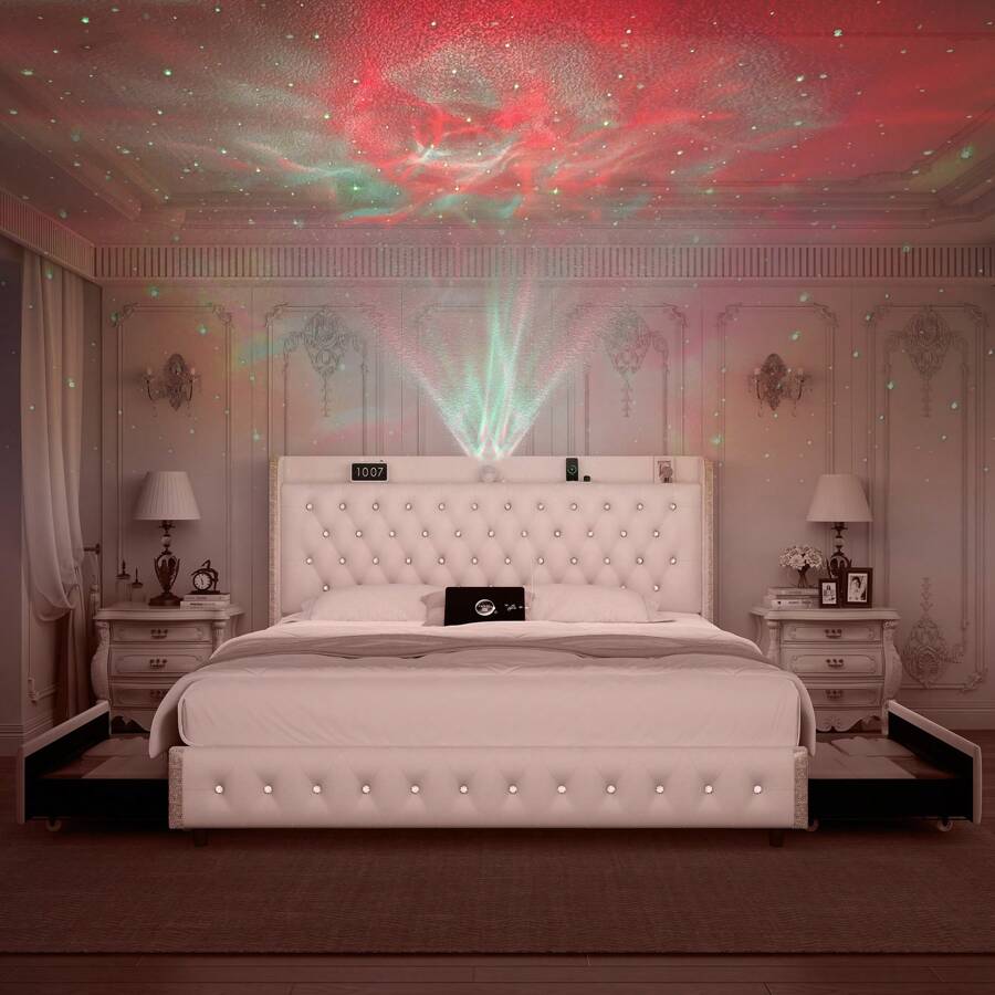 About this item: [360° adjustable galaxy projector] Create a starry ambiance with adjustable colors and speeds; control via remote or panel. [Dust-proof storage drawers] Four enclosed fabric drawers keep essentials dust-free, organized, and easy to access. Modern wingback design Upholstered headboard with crystal buttons and silver trim adds elegance to any bedroom. [Sturdy, noise-free frame] Iron frame with wood slats supports up to 1,000 lbs; anti-noise slats ensure quiet sleep. [Quick assembly for instant enjoyment] All parts in one box; assemble in 40 minutes with included tools and clear instructions. [Mattress not included] Note: Bed frame does not include mattress or bedding. Scenes:Home, Bedroom, Daily, Household, Room, For Decoration Included Components:Storage Drawer, Installation Manual, Slats, Headboard, Casters Bed Board Type:Rib Bed Board Power Supply:USB or other DC power connection Style:Modern Features:Lightweight, Rust Resistant, Storage Compartment, Sturdy, Anti-noise Color:PU white Material:Polyurethane(PU)