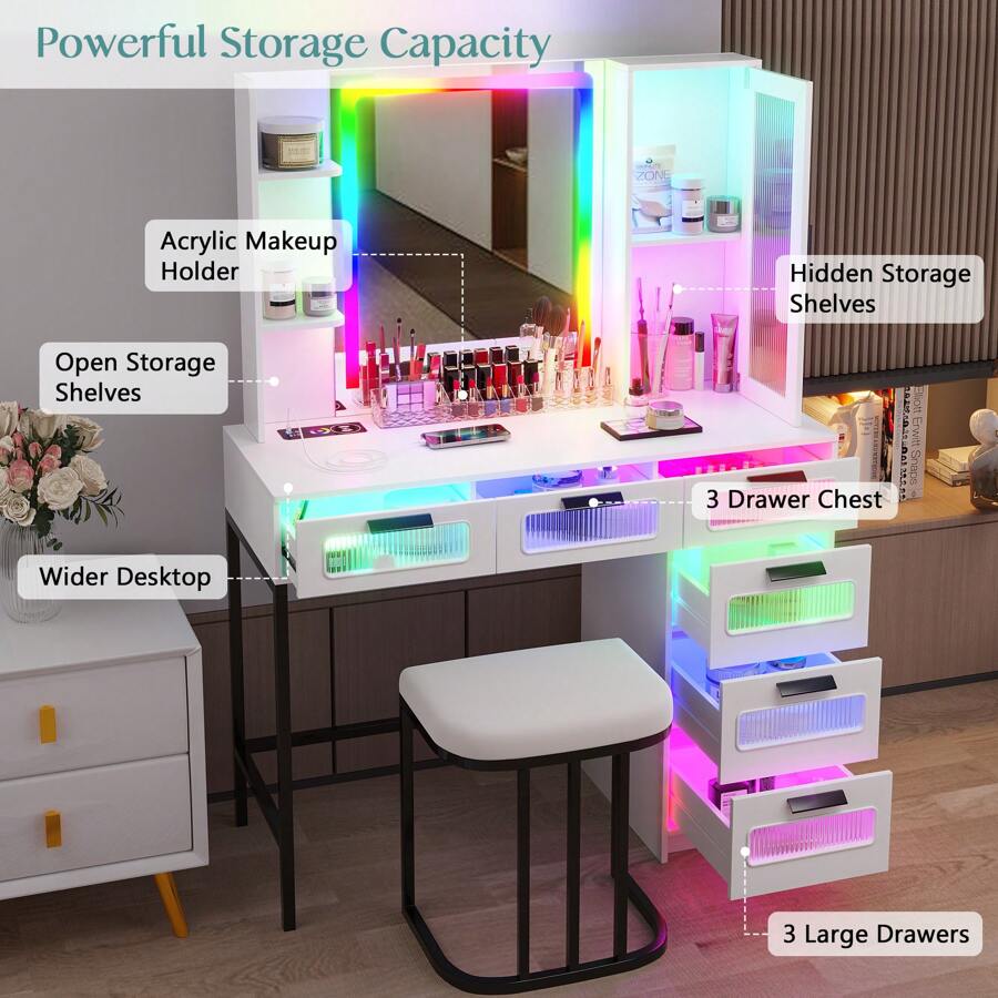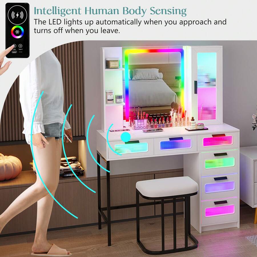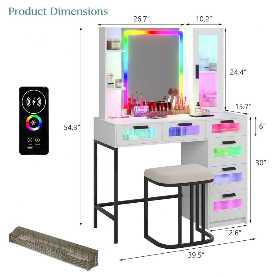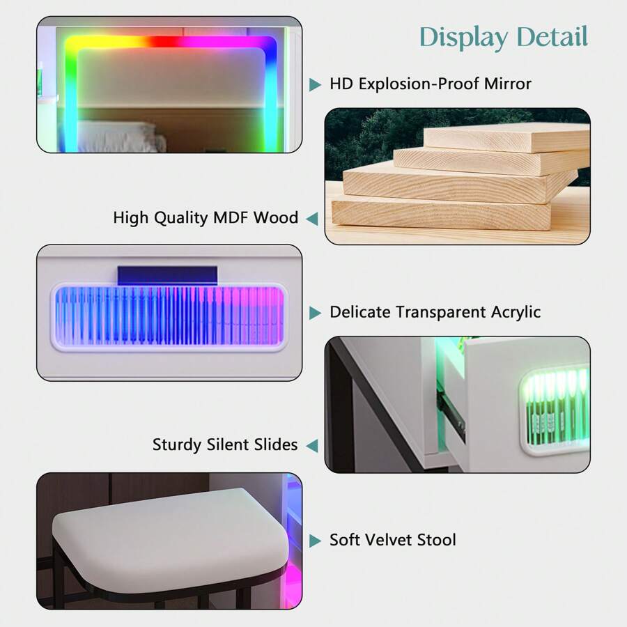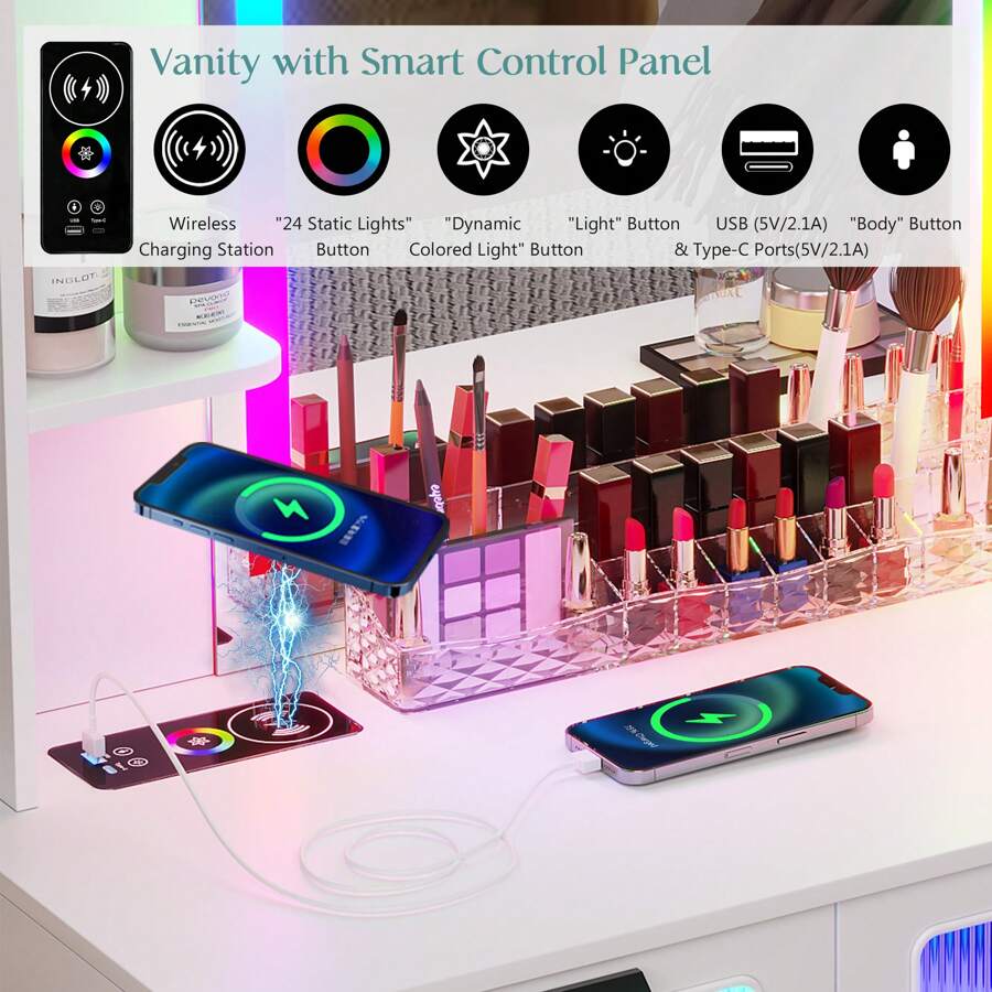 [Vanity with Colorful Lights]Our vanity table features 7 dynamic modes and 24 static modes of RGB lighting, this system deliver a stunning visual experience.The automatic sensor mode ensures that the LED lights turn on when you approach and turn off when you leave. [Vanity with Charging Station]The vanity desk is equipped with a power panel, including a wireless charging station, a USB port, and a Type-C charging port, allowing you to charge your phone, tablet, or other electronics conveniently. [Ample Storage Space]This makeup vanity offers a spacious design with open/hidden storage shelves and 6 drawers, the built-in jewelry storage box wrapped in soft flannel, perfect for storing rings, earrings, necklaces, wristwatch,and more, keep your precious accessories organized.Built-in hair dryer rack, keep your hair dryer within reach. [Large Glass Desktop]The large visible glass desktop not only provides enough desk storage space, but also clearly display the items stored in the drawer, helping you quickly find what you need.This elegant makeup desk is an eye-catching decoration in your room. [Great Gifts for Special Day]This vanity table makes for an gift that can be given to mother, wife, daughter, granddaughter and friends alike.It serves as an ideal present for a range of occasions, such as Valentine's Day, Mother's Day, Christmas, a girlfriend's birthday, or a housewarming celebration. Scenes:Home, Bedroom, Daily, Household, Room Style:Modern Features:High-capacity, Illumination, USB Port Power Supply:Wall Plug, USB or other DC power connection Color:White Material:MDF