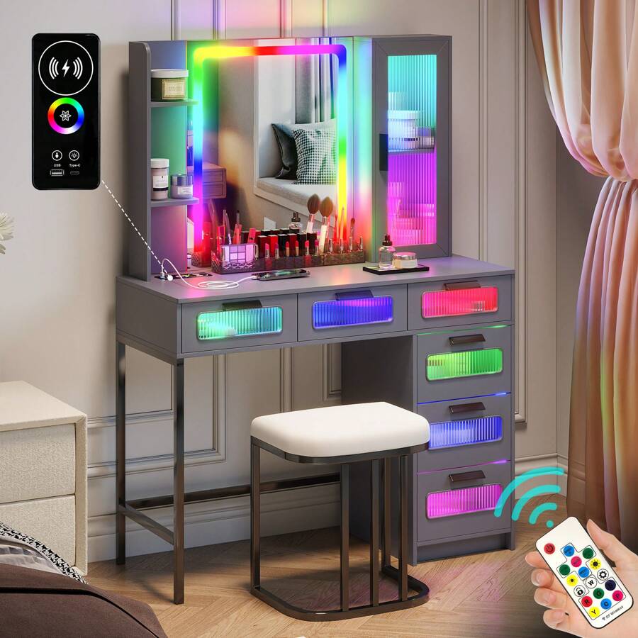 RGB Vanity Desk, Makeup Vanity With Dazzling Lights And Mirror, Glass Top Makeup Desk With USB/Type-C/Wireless Charging, Dressing Table Set With Stool/6 Drawers, Vanity Gifts For Girls/Women